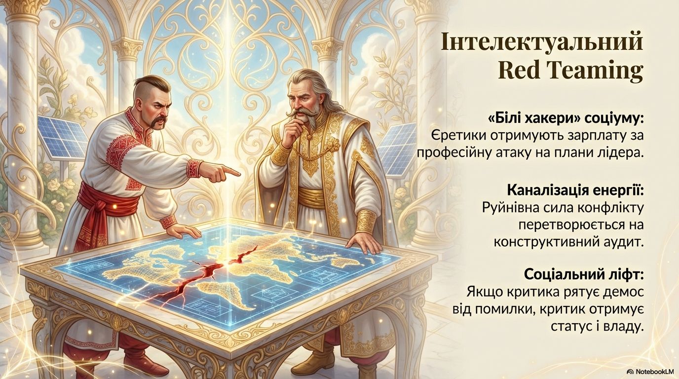 «Єретики» всередині демосу виконують роль Red Team (команди агресора) та «білих хакерів» у кібербезпеці. Вони здійснюють постійний «пентест» (тестування на проникнення) соціальної структури та стратегічних планів Гетьманату. Замість того щоб витрачати ресурси на боротьбу з внутрішніми «революціонерами» чи «екстремістами», демос пропонує їм контракт. «Єретик» отримує зарплату за те, що професійно, аргументовано та публічно критикує плани лідера. Це перетворює руйнівну енергію конфлікту на конструктивну енергію аудиту та вдосконалення з елементами гри.
