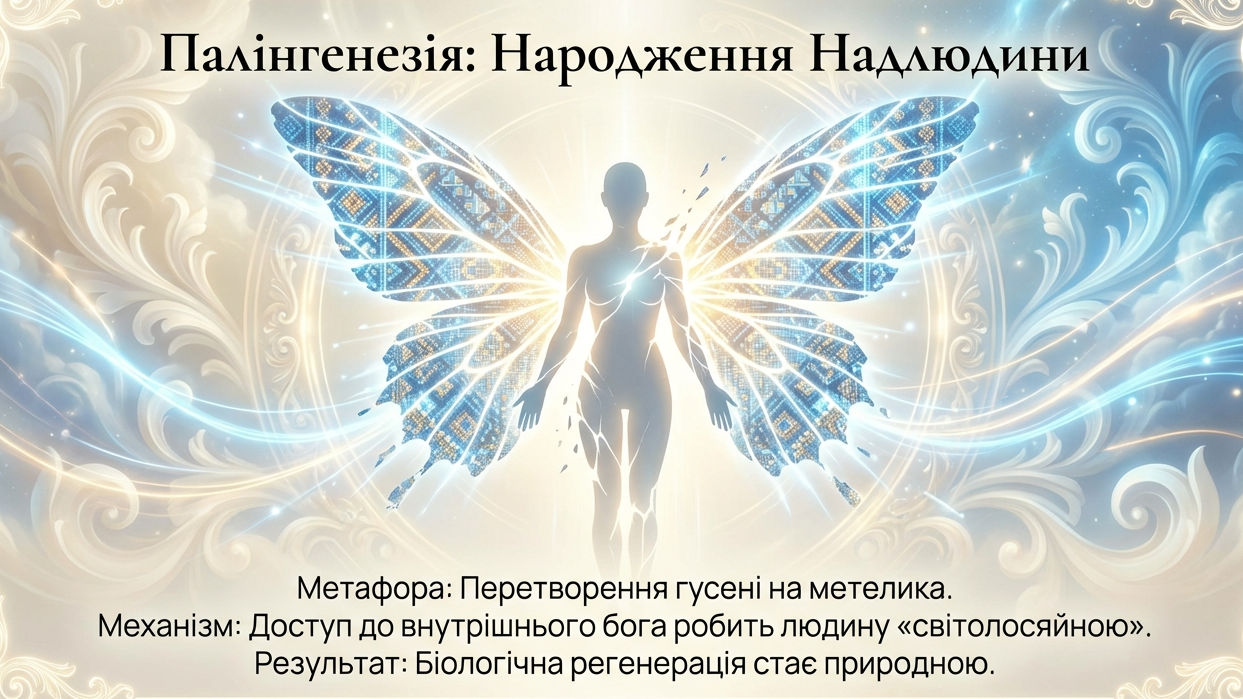 Описаний Євангелієм процес перетворення позначається терміном «палінгенезія», що буквально означає «знову народження». Йдеться про вихід зі стану Гомо дуплекс (людини подвійної) та перехід до стану Гомо триплекс (людини потрійної), що виглядає як нове народження – народження надлюдини. Для позначення триплексів Євангеліє застосовує термін «сини божі»: «Щасливі світотворці, бо вони синами божими стануть».