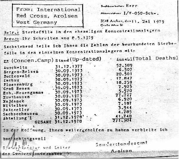 Під час одного з судових засідань проти пана Ернста Зюнделя, пан Зюндель та його адвокати примусили Червоний хрест представити дані організації щодо обліку загиблих. Червоний хрест представив документ про те, що кількість загиблих по всіх таборах склала 272 тисячі: