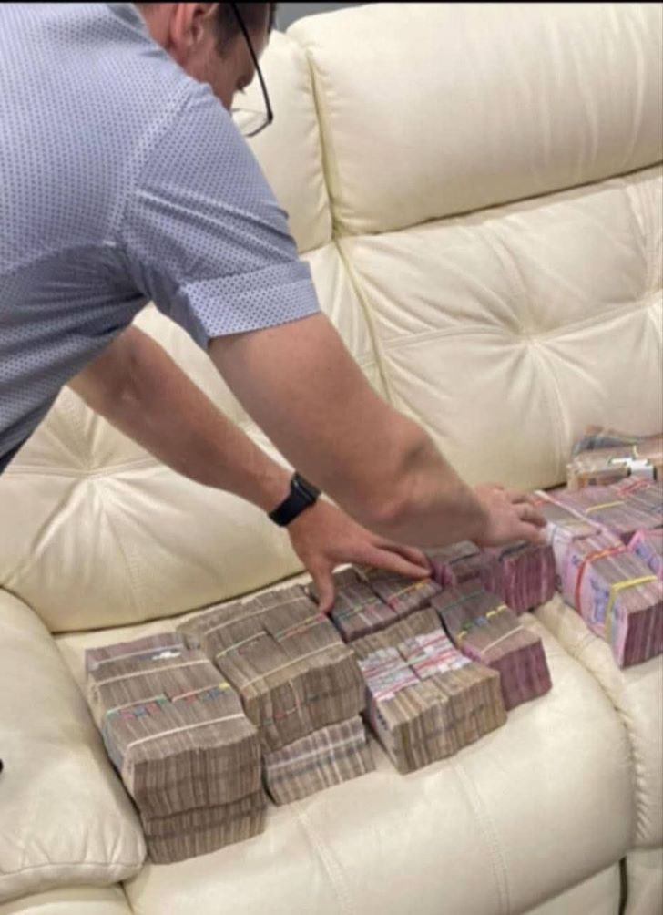 На фото Іван Баканов, якого Зеленський призначив головою СБУ у 2019 р. Іван Баканов в своєму кабінеті отримує хабар від бізнесмена Сергія Ваганяна. Ваганян зробив фото передачі грошей.