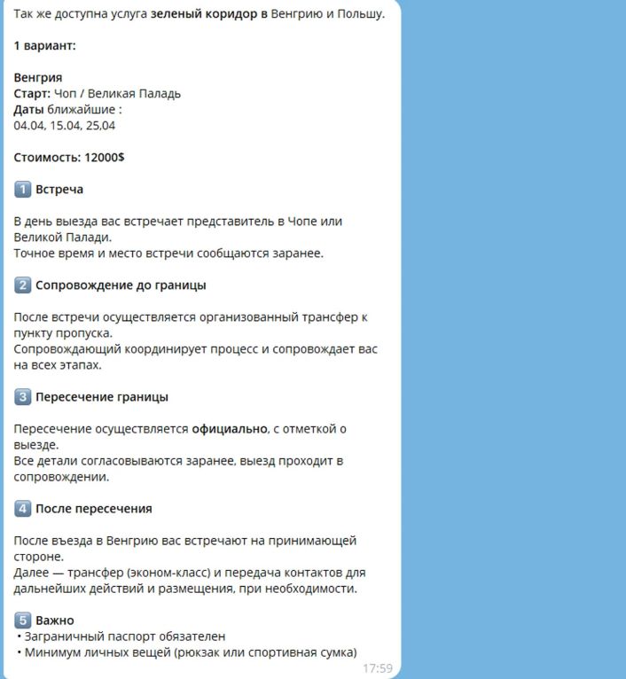 Для виїзду є сервіс з кількома тарифами. За 10 тис. дол. пропонують "спецборт", за 12 тис. дол. – "зелений коридор" через Молдову, Румунію, Польщу чи Угорщину.